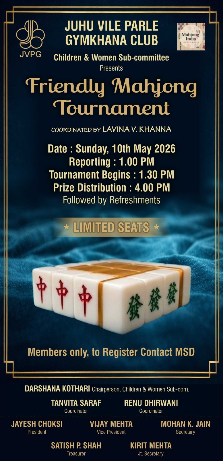 Juhu Vile Parle Gymkhana Club is a leading Sports Club in Mumbai enjoying the patronage of more than 16,500 members, comprising of leading personalities from all walks of life and distinguished sports persons who have excelled in various sports at National and International level.